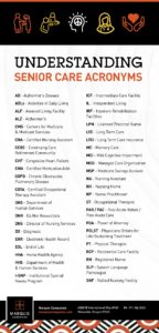 Starting the journey to find care for a senior loved one can be a daunting task. On top of all the options that are out there, trying to understand the numerous acronyms you’ll encounter can be confusing and frustrating. At Marquis, we think this process should be as easy and stress-free for all as possible. To help you, we’ve gathered the most common senior care acronyms and explained what they stand for.