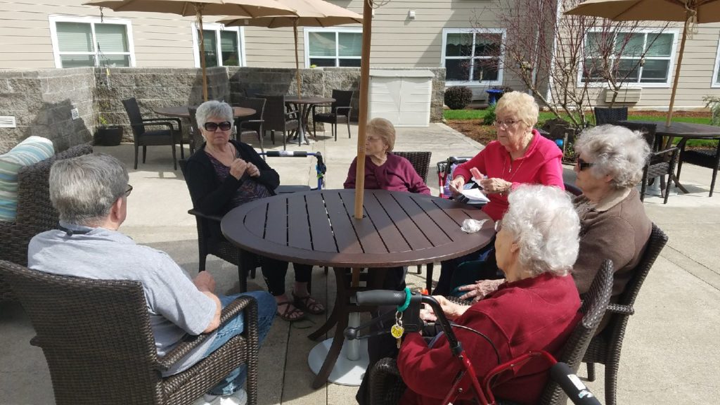 Betty’s daughter and family are coming to have dinner with her in the dining room, so her evening caregiver Martina helps her get ready. Betty’s grandkids love coming to see Grandma Betty, and they also love the dessert in the dining room. After a welcoming, comfortable visit, Betty has an evening check-in with the nurse and receives her medications. Martina helps her with toileting and getting ready for bed. Once settled, Betty goes back to her book on tape for a bit more listening before she decides she’s ready for sleep.